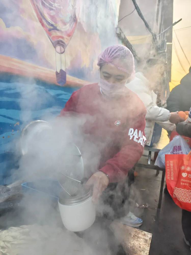 尽管她们的孩子正在经历病痛,但在这个特殊的厨房里,每个人都努力营造着家的温暖。 另一边,厨房门口生火烧水,里里外外忙得热火朝天。5200只饺子,在大家的共同努力下,一个个成型、下锅、飘香。