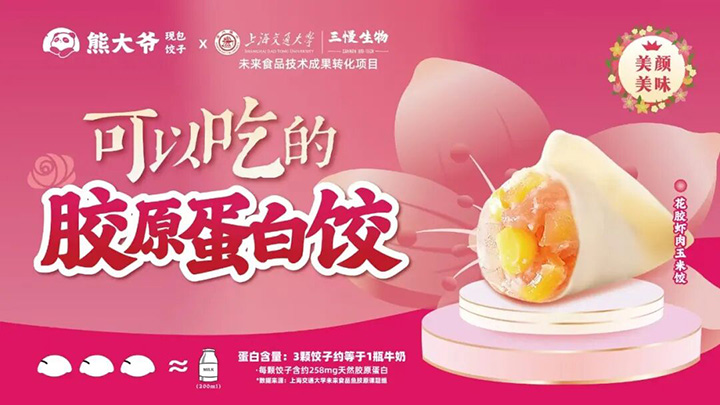 双方共同成立“三慢生物”技转项目,首期以高蛋白为核心,创新研发“花胶鲜肉饺”,实现单颗饺子胶原蛋白含量超200毫克的突破。该产品在保留手工饺子劲道口感的同时,完成营养结构的科学升级,推动现包饺子从“好吃”迈向“吃好”。