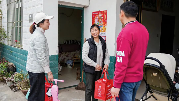 吃完午饭,活动并没有结束。下午,团队带着孩子们亲手包制的饺子礼盒,走进了妈妈农场周边的住家户。
