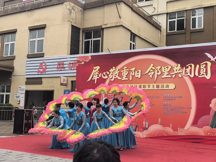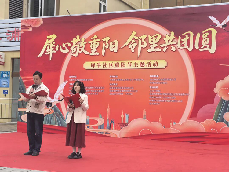 “犀心敬重阳 邻里共团圆”横幅高挂
